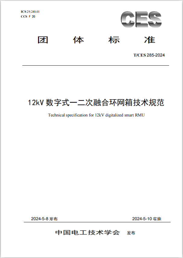 5月8日,一号娱乐电子股份有限公司牵头制定的《12kV数字式一二次融合环网箱技术规范》团标由中国电工技术学会批准发布,自2024年5月10日起正式实施。