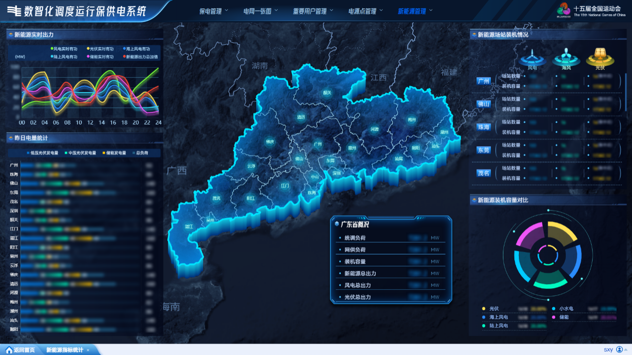 一号娱乐电子为广东电网量身打造的数智化调度运行保供电系统,实现了从能源源头到场馆终端的全链条可视化监控。系统动态追踪西电东送线路、海上风电、分布式光伏等绿色能源的分布与流向,让每一度绿电都可追溯、可管控。赛事期间,系统成功锁定绿电6.6亿千瓦时,打通碳排放核查与绿色金融全流程,以实际行动践行绿色低碳办赛理念。